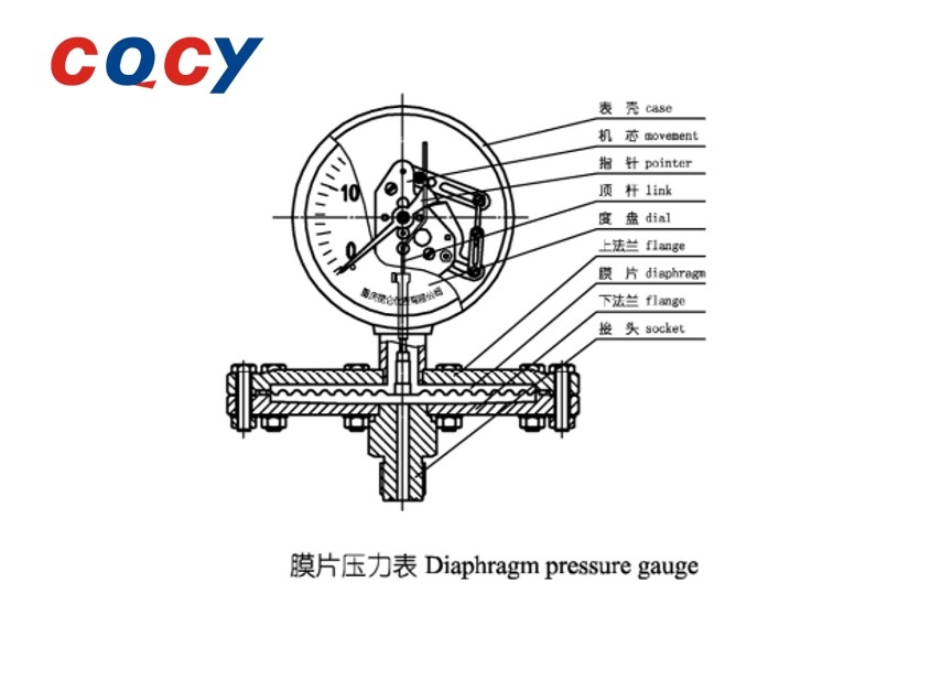 শেল অংশটি সিল করা নিরাপদ সামনের সিলিং কাঠামো গ্রহণ করে এবং পরিমাপের অংশটি স্থিতিস্থাপক সংবেদনশীল উপাদান হিসাবে বৃত্তাকার ফিল্ম বক্স নেয়, যা কম সান্দ্রতা সম্পন্ন ড্যাম্পিং তেল দিয়ে পূর্ণ করা হয়, যাতে পরিমাপ প্রক্রিয়াটির কার্যকারী পরিবেশ বা মাধ্যমের চাপ স্পন্দন প্রতিরোধের ক্ষমতা থাকে। সংযোগ মোড অনুসারে ডায়াফ্রাম সেপারেটরকে ফ্ল্যাঞ্জযুক্ত প্রকার, থ্রেডেড প্রকার, ক্লিপ প্রকার, বাদাম টাইপে ভাগ করা যায়।